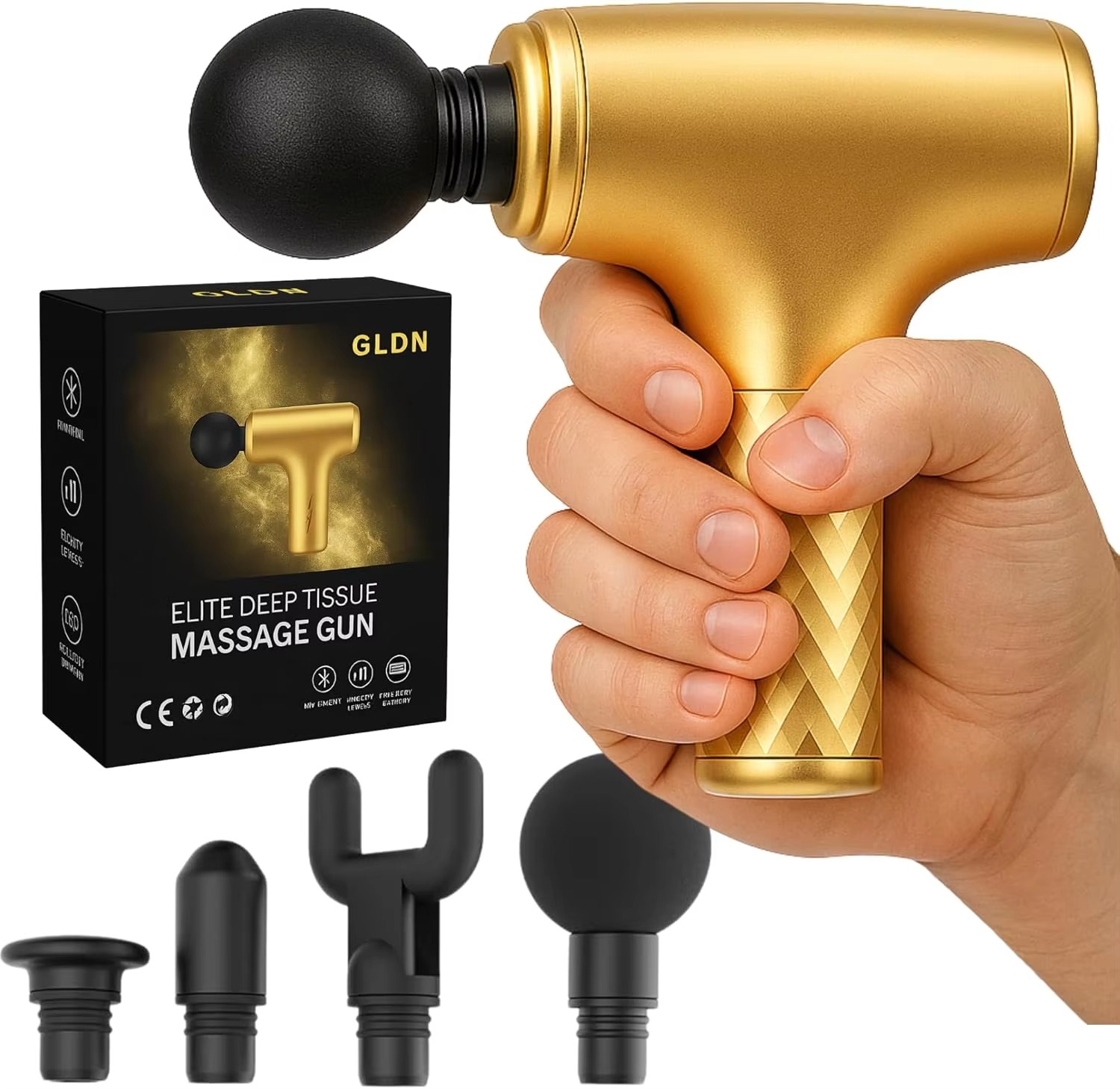 Relieve muscle pain anytime, anywhere with this Gold Finish Mini Massage Gun. Designed for deep tissue percussion therapy, it features 4 interchangeable massage heads, a compact yet powerful motor, and a luxurious gold finish. Ideal for back, neck, shoulders, and full-body muscle recovery, this portable electric massager delivers professional-grade relief at home, the gym, office, or while traveling.