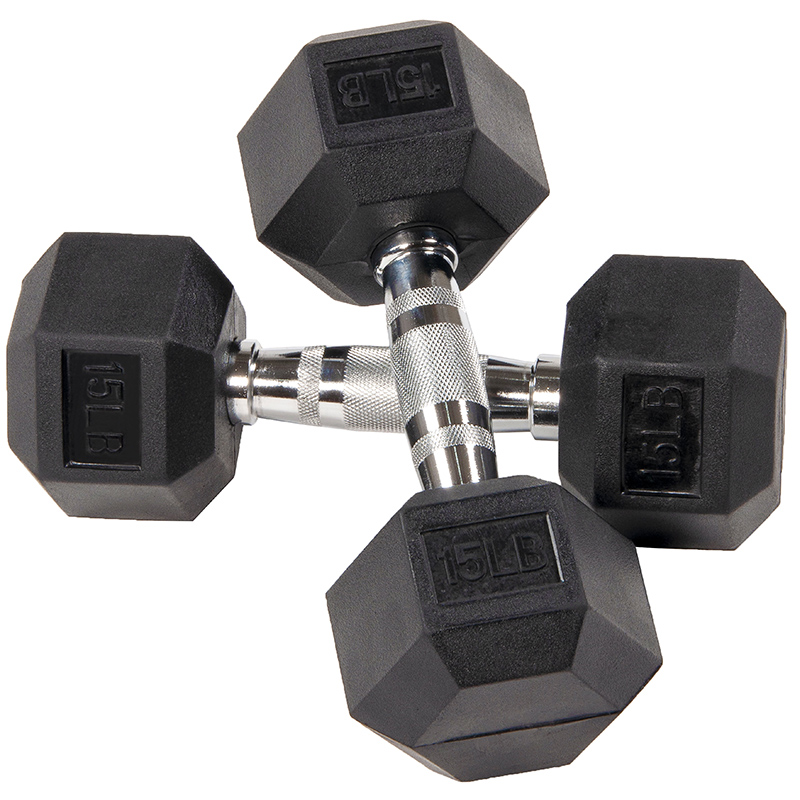 Upgrade your home workouts with this 15 lb pair of rubber‑encased hex dumbbells—durable, floor‑protecting, and ergonomically designed with knurled chrome handles for a non‑slip grip.